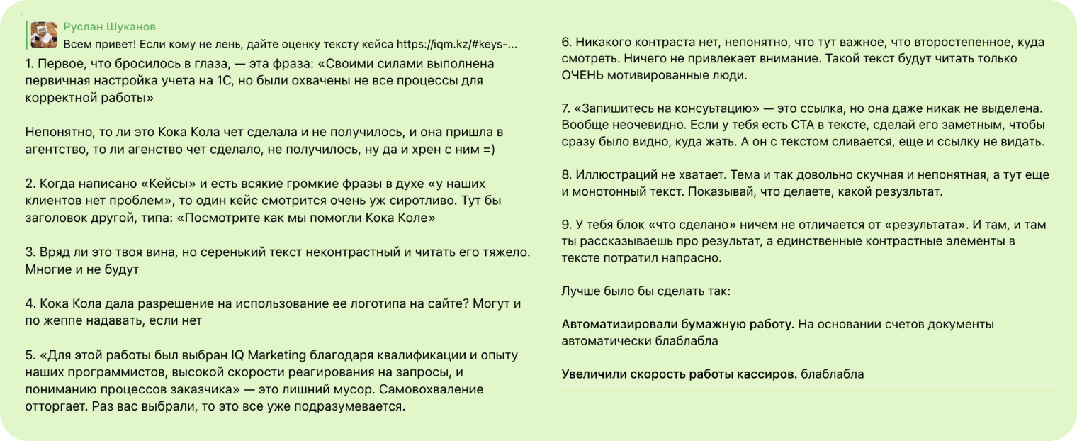 Это самый полезный канал в моей телеге. Захожу в «Цех» регулярно. Сейчас началась неделя кейсов — как оформлять, как иллюстрировать, что писать. Теперь буду составлять кейсы клиентов еще более круто. До этого я покупала обучение копирайтингу в «Сделаем», и «Цех» для меня — как следующая ступень.