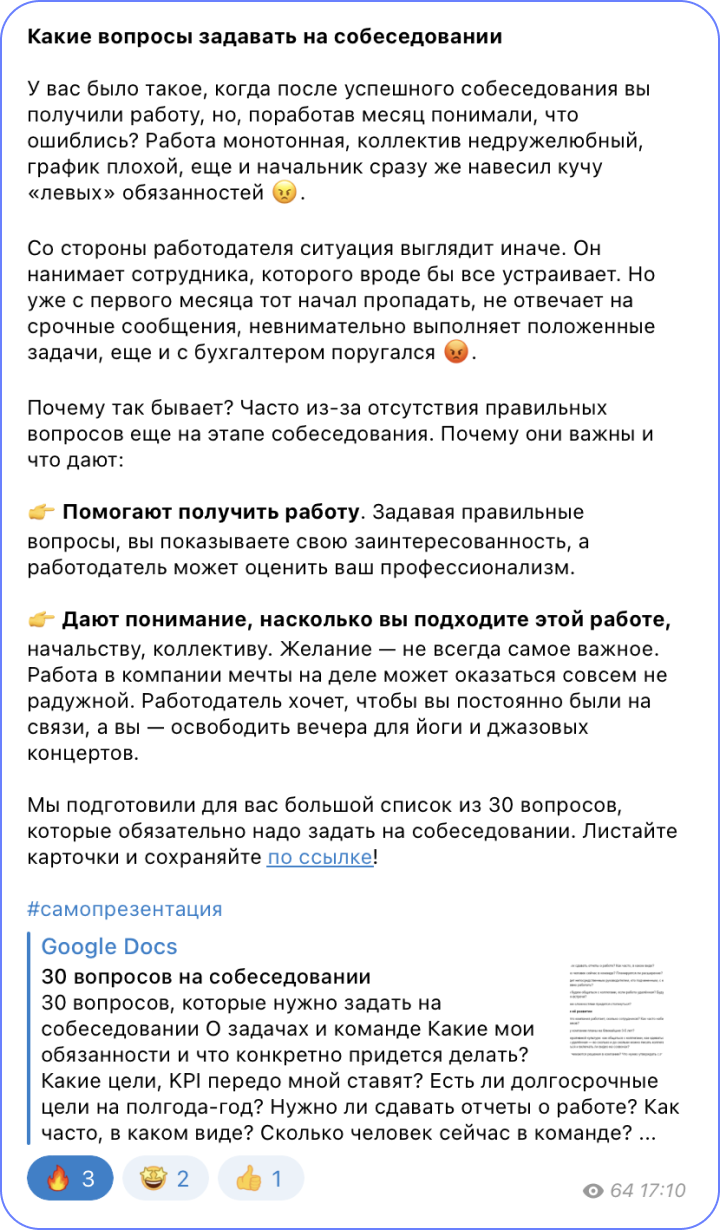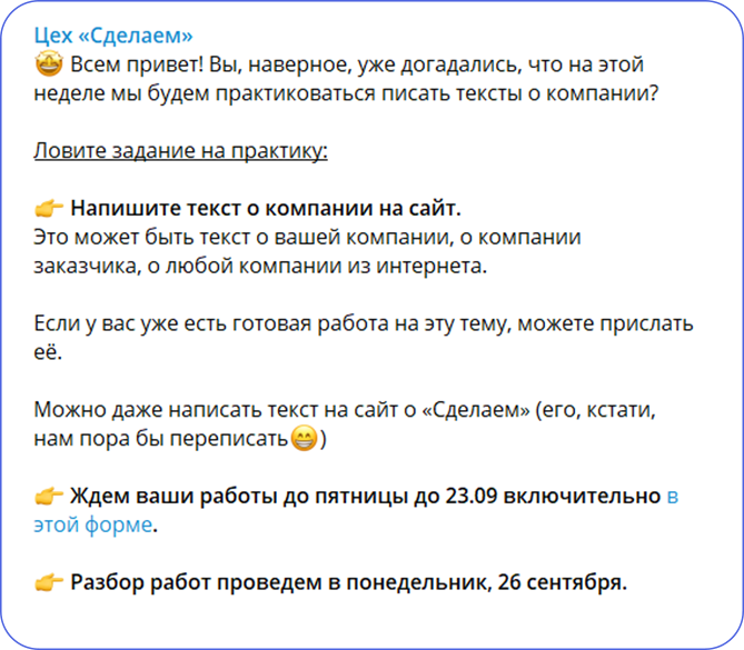 Команда агентства «Сделаем» время от времени преподносит своим подписчикам и не только им сюрпризы. Для меня таковым стало приглашение в новый закрытый чат в ТГ для копирайтеров с контентом из серии «бери и пользуйся» — рабочими советами, гайдами и кейсами, а не просто обзорными статьями и трёпом за жизнь. Успел подписаться по льготной цене за 300 ₽ в месяц. Сейчас подписка на «Цех» — так назвали чат — стоит 600.